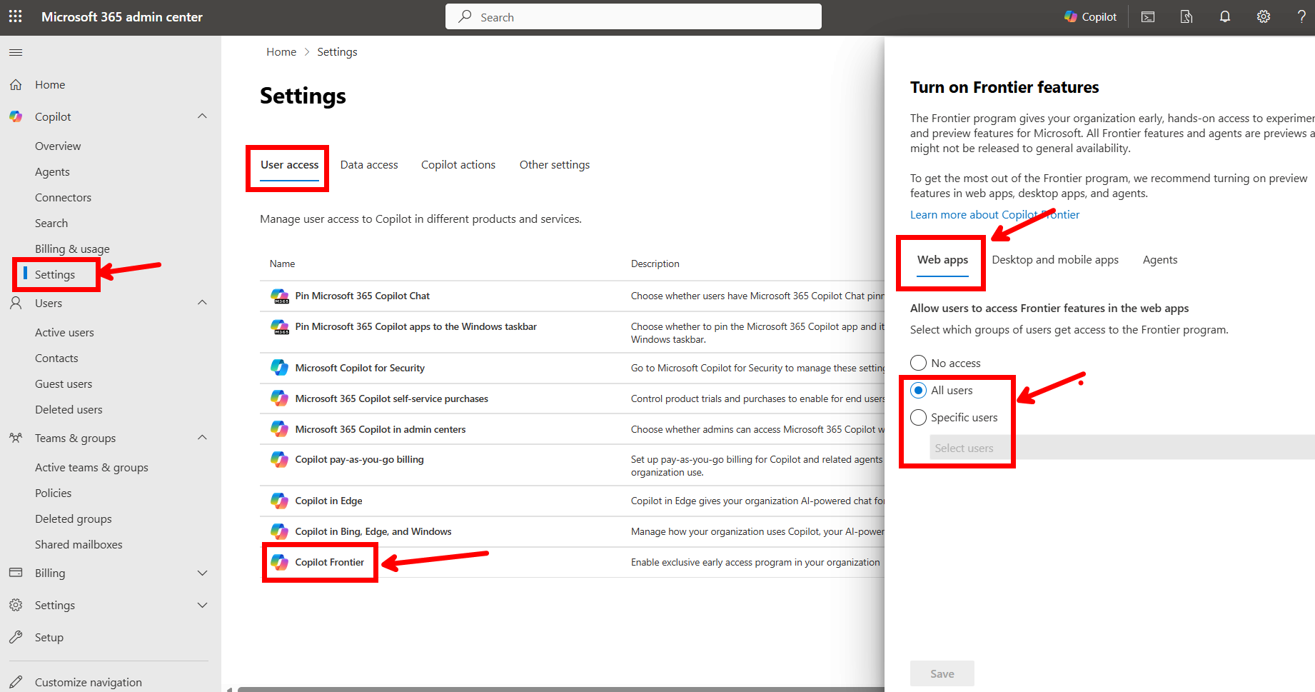 - [Copilot] - [Settings] - [User access] - [Copilot Frontier] 로 이동
