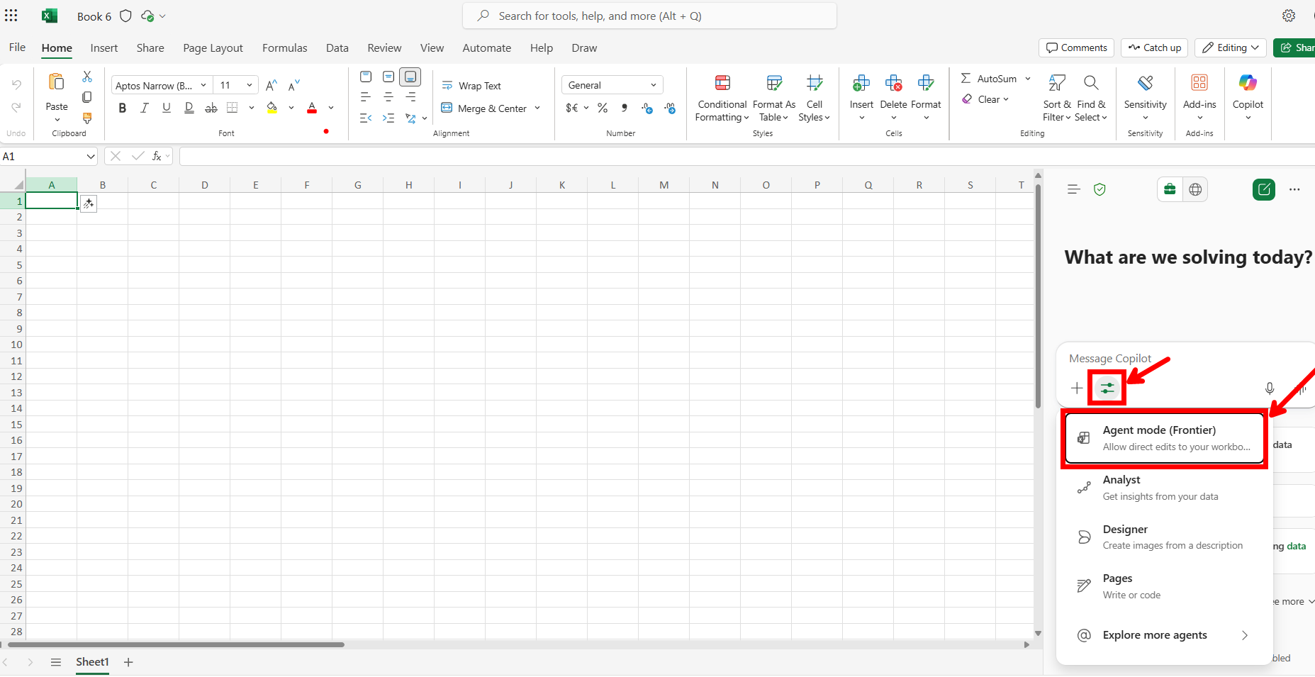 - 최대 24시간 정도 대기 후 Frontier 프로그램이 활성화된 사용자의 계정으로 들어가보면 예를 들어 엑셀 같은 경우 Agent Mode가 활성화 되어 있는 것을 확인할 수 있음.